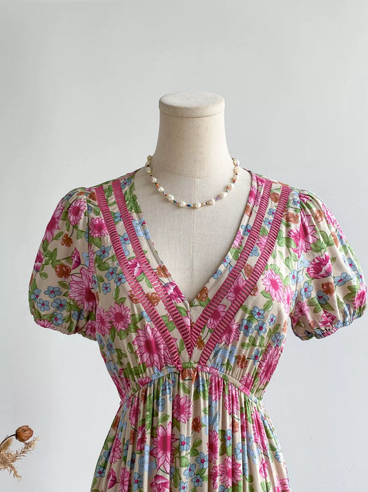 BLUE/MUSTARD PRINT VINTAGE DRESS SZ 6 (FITS 8/10)