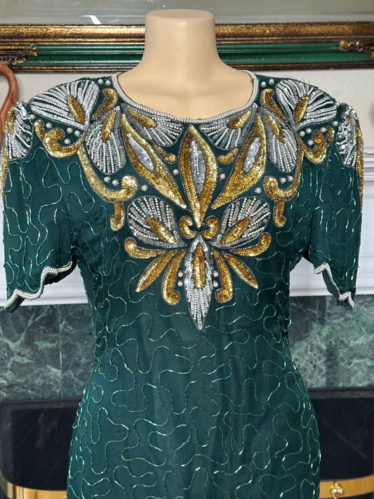DENISE ELLE 100% silk shell Emerald Green and Gold Sequin dress sz L 20” pit