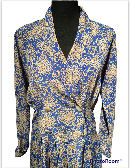 BLUE/MUSTARD PRINT VINTAGE DRESS SZ 6 (FITS 8/10)