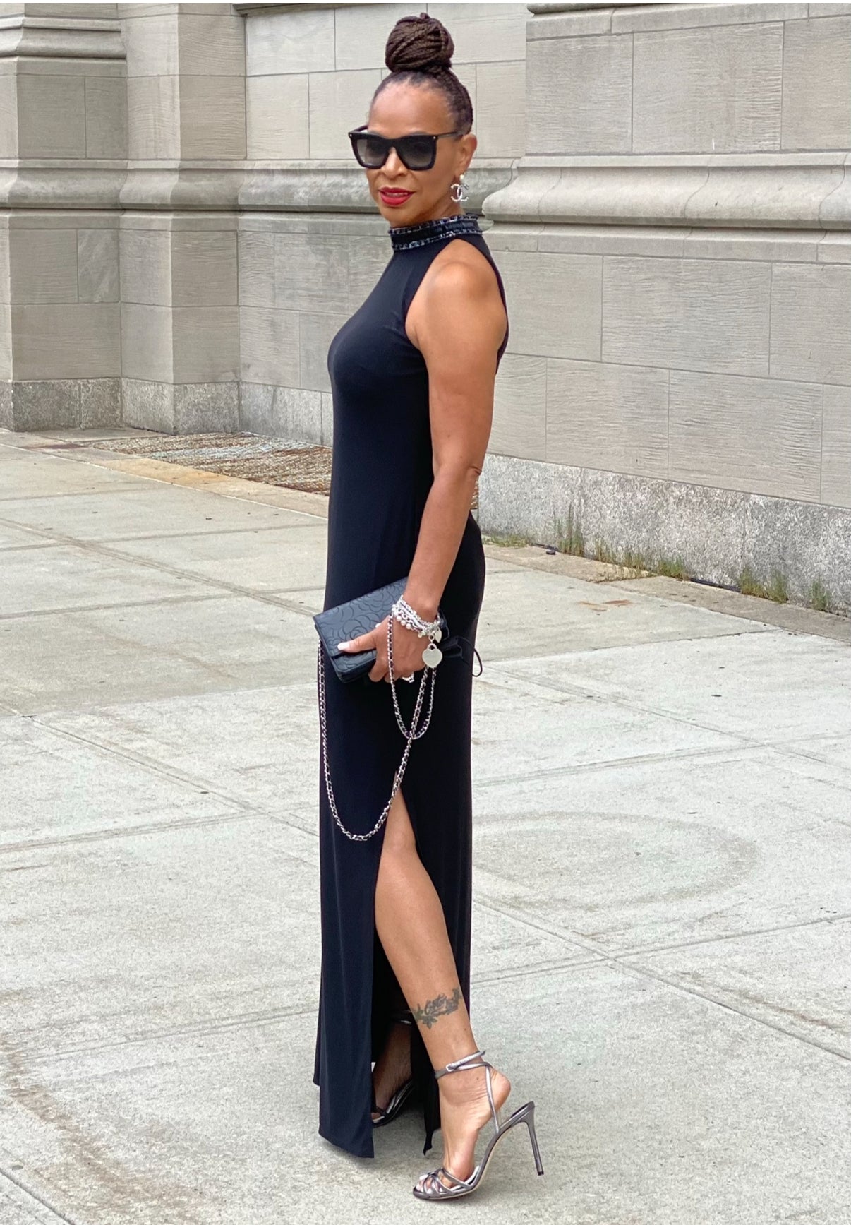 Rhinestone embellishment around the neck key back closure splits on both sides sheet dress